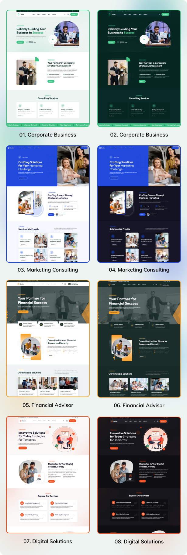 - 08 Demo Homepages: You can choose the perfect home from our builds and adjust it to your needs. You can adjust everything easily from Theme Option and Elementor page builder